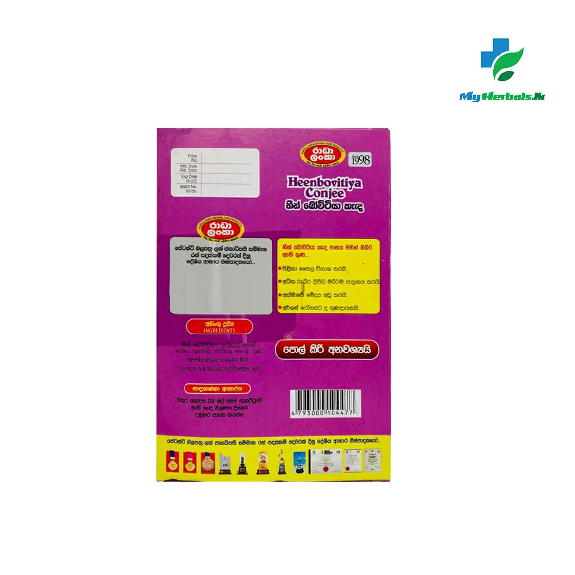 Ingredients Heirloom Rice (Kalu Heenati/Suwadel), Dehydrated Heenbovitiya Leaves, Country Spices, Coconut Powder, and Salt.