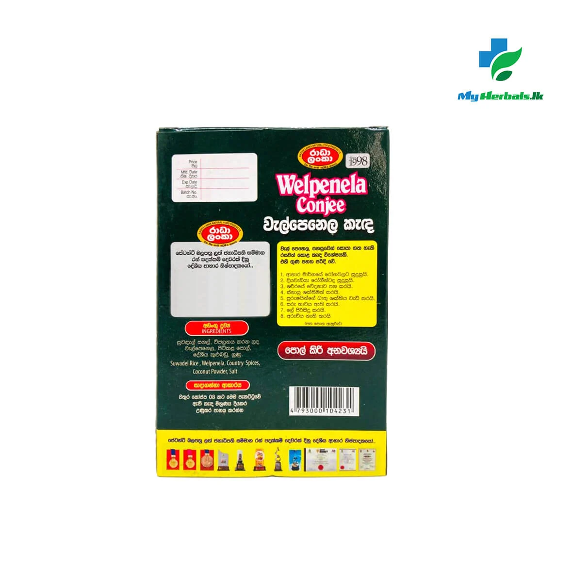 Ingredients Suwadel Rice, Welpenela (Cardiospermum halicacabum), Country Spices, Coconut Powder, and Salt.